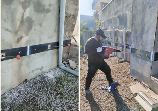 Se realizó una fila de anclajes de 4,5 m cada 1,20 m, ayu­ dados de una plancha metálica para repartir los esfuerzos de los anclajes en el muro. La duración del tratamiento (una medición de 17 ML de muro en planta), fue de escasos dos días, pudiendo tensar los anclajes a las pocas horas de su inyección, optimizando así los tiempos de obra.